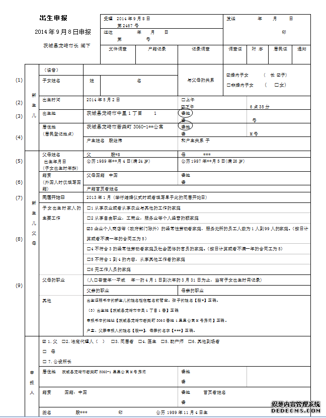 應該用2張A4紙分別翻譯左側的【出生屆】與右側的【出生證明書】,不可翻譯在一張A4Z紙上,以免給轄區(qū)派出所存檔確認帶來困擾。